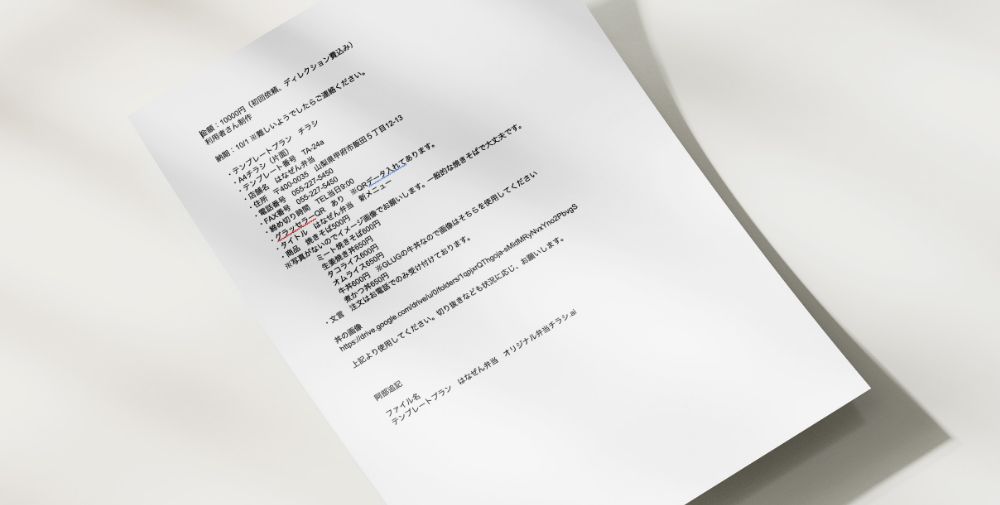 専用のデザイン発注書がございます。発注書に沿ってご希望の内容をご記入いただくだけで簡単に依頼が可能です。文章での指示が難しい内容などは、お電話でも可能です。その場合、コミュニケーションミス・トラブル防止のため、お聞きした内容にお間違いがないかメールをお送りさせていただきます。